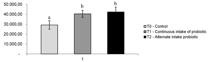 The experimental design was completely randomized with three treatments and four replicates. The treatment groups were: T0 control (feed with no addition of probiotic), T1 continuous intake of probiotic (feed with addition of probiotic), and T2 alternate intake of probiotic (7 days of feed with addition of probiotic and 7 days of feed with no addition of probiotic) at a dose of 0.5 g kg-1 of feed, during all experimental period.