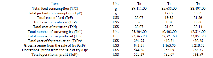 The extra expense related to addition of the probiotic was considered in an economic feasibility evaluation. The price of the feed and the probiotic corresponded to $ 0.56 (US) and $ 60.00 (US) per kilogram, respectively. The economic analysis was performed through adaptation of the variables obtained by Costa, Sabbag, Ayroza, and Martins (2017) applied to the total viable fry number obtained at the end of the experiment.