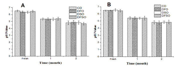 Figure 1 shows the changes in pH of the soft cheese made from the milk of lactating buffaloes and cows fed on the DFO, DSO or DFSO during storage at 5 ± 2°C for 2 months. The pH value of cheese had no significant affected (p > 0.05) by the type of milk or the feeding diet at different storage periods. Both buffalo's (Figure 1A) and cow's (Figure 1B) soft cheese showed a significant decrease in pH (p < 0.05) during storage period (2 months). The range of pH decrease was 1.61 to 1.71 units in buffalo's cheese and was 1.60 to 1.74 units in cow's cheese indicated that no significant difference in the pH decrease (pH > 0.05) during storage between buffalo's and cow's cheese (Effat, Mabrouk, Sadek, Hussein, & Magdoub, 2012; Farrag, El-Sheikh, Fouad, Sayed, & Abd El-Aziz, 2019). The decrease in pH may be due to the convert of residual lactose in cheese to lactic acid and free fatty acid which had developed in the cheese at the end of the storage period (Yerlikaya & Ozer, 2014).