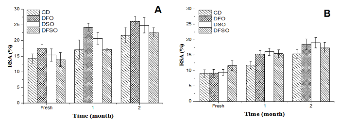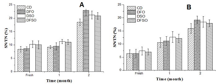 Cheese proteolysis, as measured by water soluble nitrogen/total nitrogen (WSN/TN ratio), of soft cheese is depicted in Figure 2A and B. Buffalo's soft cheese exhibited a higher WSN/TN ratio than cow's soft cheese; the difference was significant only at month 2 (p < 0.05). The increase of WSN/TN ratio in fresh buffalo's soft cheese may be due to the whey proteins in buffalo's milk is more resistant to heat treatment than that in cows' milk. During the storage period, soft cheese samples showed a continued increase in proteolysis being significant (p < 0.05) at month 1 and 2 for cow's cheese whereas for buffalo's cheese the changes were significant at month 2 (p < 0.05). Similar trends were observed by Ismail et al. (2011), Abd El-Aziz, Mohamed, Seleet, and Abd El-Gawad (2015) and Todaro et al. (2017) they reported that storage cheese showed higher solubility than fresh cheese. The increase in proteolysis could be due to the proteolytic activity of the starter bacteria, non-starter bacteria and residual rennet. Several chemical and biochemical reactions can occur during cheese ripening such as degradation of the casein matrix of the curd to a range of peptides, which is followed by degradation to free amino acids (Sgarbi et al., 2013). However, the DFO, DSO or DFSO had no significant effect (p > 0.05) on the cheese proteolysis during the cold storage period. Such an effect was found in both brined Tallaga cheese and that made from high CLA milk with slight differences between the two treatments (Abd El-Salam et al., 2011).