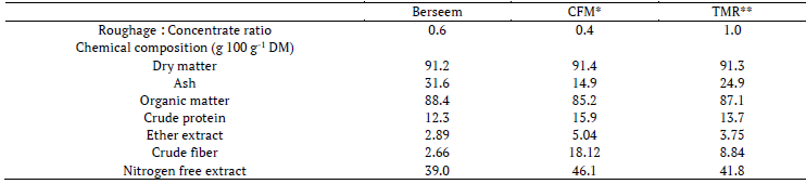 Buffalos or cows were milked by hand twice a day at 7:00 and 18 h during the last three days (i.e. days 26 to 28) of each experimental period. Milk samples were collected during morning and evening times from each animal to record the milk yield. The sample of each animal represented mixed samples of constant percentage of the evening and morning yield. Milk samples were analyzed for total solids, fat, protein, lactose, and ash by Bentley150 infrared milk analyzer (Bentley Instruments, Chaska, MN, USA), and then frozen at -20°C until soft cheese manufacture.