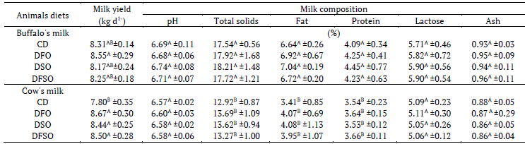Milk yield and composition of Egyptian lactating buffaloes and cows fed a diet supplemented with flaxseed oil (DFO), soybean oil (DSO) or flaxseed plus soybean oils (DFSO) compared with control diet are shown in Table 2. DFO, DSO or DFSO had an appositive effect on the milk yield of cows (p < 0.05) resulting in 11.15, 8.21 or 8.97% increases compared with cows received the control diet, respectively. Such an effect has been found by Dai, Wang, and Zhu (2011) and Antonacci, Gagliostro, Cano, and Bernal (2017) in cows fed a diet supplemented with different plant oils. However, there was no difference in milk yield of lactating buffalo fed a DFO, DSO or DFSO (p > 0.05) compared with the control diet. These results are agreement with many researchers as well (Vafa, Naserian, Moussavi, Valizadeh, & Mesgaran, 2012). Milk fat, protein, lactose and ash contents were not significantly affected in both buffalos and cows fed diets (p > 0.05). Also, a DFO, DSO or DFSO caused a slight improve in the fat and proteins contents, and hence improve the total solids content of the resultant milk (p > 0.05). The pH value, lactose and ash contents did not affect in both buffalos and cows fed diets. Caroprese et al. (2010) have reported the milk yield and composition could depend on several factors such as the breed, genetic variation, health, environment, management practices, and diet as well as the source of fat and the level of supplementation. These results indicated that the type of diet does not make a significant change in milk composition as much as the amount of milk production.