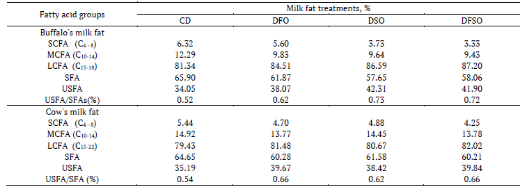 Table 3 present the main groups of fatty acids composition of milk fat produced from lactating buffaloes and cows fed a DFO, DSO or DFSO. Buffalo's milk fat was higher in short chain fatty acids (SCFA), and long chain fatty acids (LCFA) but lower in medium chain fatty acids (MCFA) than cow's milk fat, the difference in unsaturated fatty acids USFA and USFA/SFA ratio was not clear. Penchev, Ilieva, Ivanova, and Kalev (2016) have reported the buffalo milk displayed significantly lower contents of C8:0-C14:0 and higher of C18:1, total SFAs being lower compared to the cow milk. However, supplementing the diet of both cows and buffalos with flaxseed oil, soybean oil or their mixture decreased short chain- (SCFA), medium chain- (MCFA), and saturated fatty acids (SFA), and increased long chain (LCFA) and unsaturated fatty acids (USFA) as well as USFA/SFA ratio. The DSO was more effective for increasing USFA and USFA/SFA ratio followed by the DFSO in buffalo's milk fat whereas DFO and DFSO were more effective in cow's milk fat compared with the control diet. The USFA representing an increase of 24.25 or 23.05% in milk fat of buffalos fed DSO or DFSO whereas the increase was 12.73 and 13.21% in milk fat of cows fed DFO or DFSO, respectively. These results are compatible with Caroprese et al. (2010) in milk fat when crushed flaxseed supplements were used. Milk’s fatty acids are entirely related with the ruminant’s diet; including the feed and intake levels as well as accumulation of USFAs, especially oil plants that are rich in linolenic acid (Vargas-Bello-Pérez & Garnsworthy, 2013).