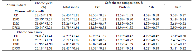 ABSTRACT. : Produce and compare soft cheese with potential benefits of human health from Egyptian buffalo's and cow's milk was studied. Eight Egyptian lactating buffalos and cows were fed a total mixed ration supplemented with either 0% oil (CD), 2% flaxseed oil (DFO), 2% soybean oil (DSO), or 2% of their mixture (1:1, DFSO) according to a double 4 x 4 Latin Square design. Milk yield was similar between buffalo's diets but was higher in cows fed a DFO, DSO or DFSO resulting in 11.15, 8.21% or 8.97% increases compared with the control diet, respectively. Milk composition was not significantly affected in both buffalos and cows fed diets. The DFO, DSO or DFSO displayed decreased short-chain fatty acids, especially DSO and DFSO (3.73 and 3.33%, respectively) when compared to CD for buffalo milk (6.32%). The DSO and DFSO were more effective for increasing unsaturated fatty acids followed by the DFSO in buffalo's milk fat (42.31 and 41.90 %), whereas DFO and DFSO were more effective in cow's milk fat (39.67 and 39.84%), respectively. DFO, DSO or DFSO had no significant effect on the yield, composition and sensory properties of resultant soft cheese compared to the CD for both lactating cows and buffalos. During storage, a diet rich in unsaturated fatty acids enhances protein proteolysis and antioxidant activity of soft cheese during storage compared to the CD especially for soft cheese produced from buffalo's milk.