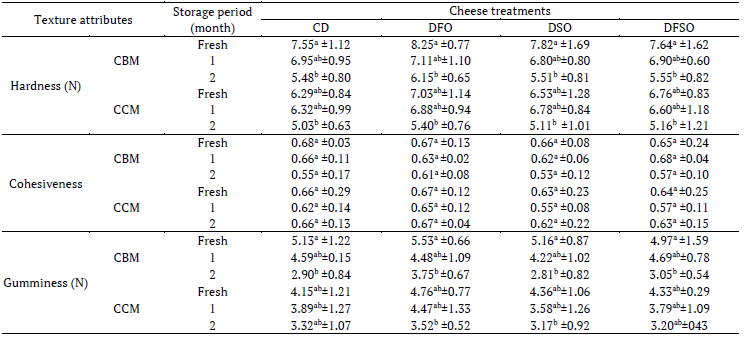 The texture profile analysis (TPA) method is an instrumental texture measurement using double bite compression and was developed to imitate the compressing action of molar teeth during food mastication. TPA of soft cheese was measured with a multi-test 1-d texture analyzer (mecmesin limited, Slinfold, West Sussex, UK). Experiments were carried out by a compression test that generated a plot of force (N) versus time (sec). Samples were double compressed at a compression speed of 2 cm/min G. The analysis was carried out at 10 EC. Hardness (N), cohesiveness and gumminess (N) were calculated from the obtained TPA according to the definition given by the International Dairy Federation [IDF] (1992).