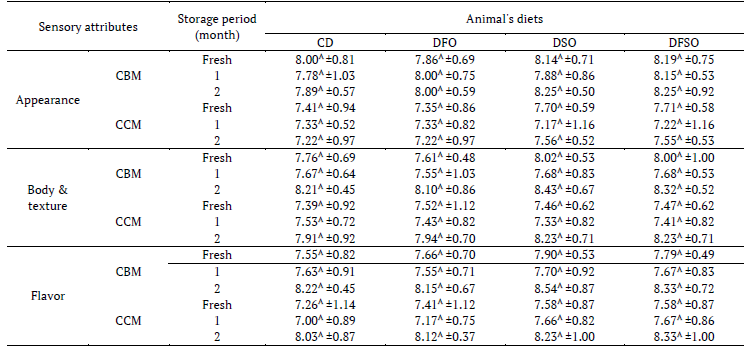 The hedonic scale evaluation of sensory attributes of soft cheese during storage at 5 ± 2º C for 2 months is shown in Table 6. There was no significant difference in sensory attributes (p > 0.05) including appearance, flavor and body & texture among all cheese samples during different storage periods. Both of fresh buffalo's and fresh cow's cheese characterized with white color, milk order, salty taste, soft body and grittiness during mastication. After 2 months, the flavor and texture scores were higher than the fresh cheese and those after 1 month storage; the changes not significant (p > 0.05). Cheese samples more softness and solubility as well as more odor of cheese flavor compared to fresh cheese samples. During storage, the breakdown of fat and protein by the activity of microbial and residual rennet more gives a smooth texture and produced more flavoring compounds in cheese (Papetti & Carelli, 2013). The improving in cheese flavor and texture during storage was also observed by Rohani et al. (2010) and Todaro et al. (2017). Rohani et al. (2010) reported that the sensory properties of UF-Feta cheese did not significantly change, whereas the flavor and texture scores at month 3 were higher than that after two months of storage. Also, the type of feeding had no significant effect on the sensory attributes of soft cheese.