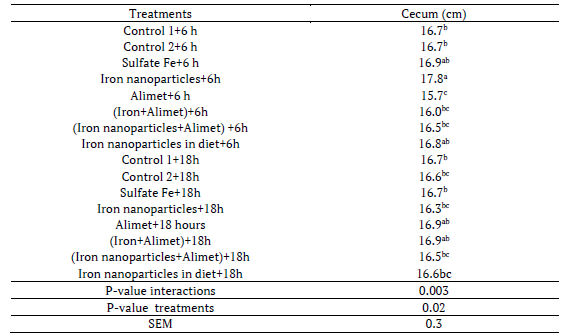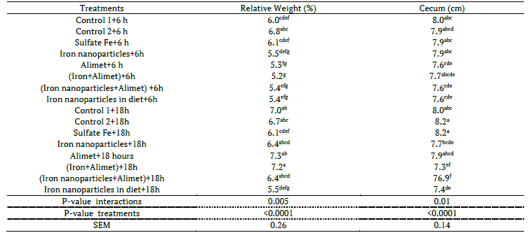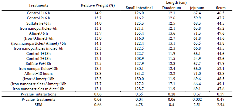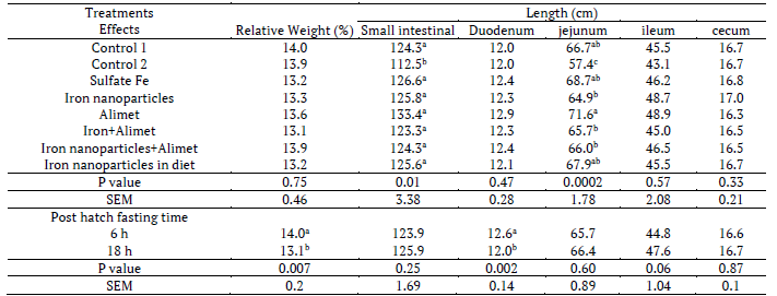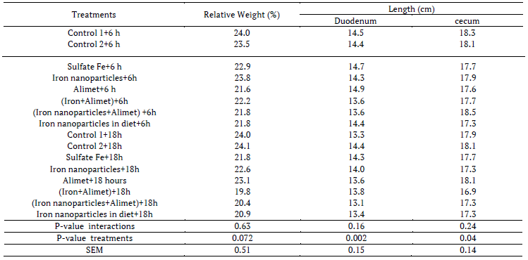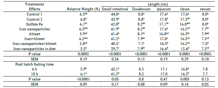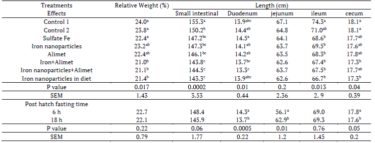 In day-old chickens the highest increase in intestinal relative weight (p < 0.05) was obtained by treatment iron+Alimet with late feeding. Small intestinal length was increased by treatment control 1 and 2 (p < 0.05). Small intestinal and ileum length were increased by early feeding as well as increased cecum length by treatment control 2 and late feeding period (p < 0.05) (Tables 1, 2, 3)