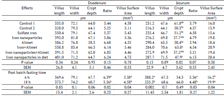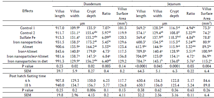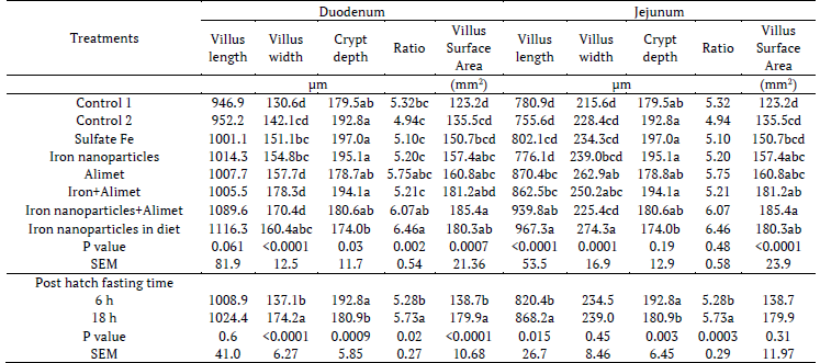 The results in day-old chickens have indicated that no significant differences were shown with the main and interactions effects of treatments in duodenum intestinal morphology (p < 0.05) (Tables 10, 11). In exception of early feeding could increase the ratio of duodenum villus length to crypt depth and duodenum villus surface area (p < 0.05). In addition, jejunum villus length and ratio villus length to crypt depth were increased by early feeding (p < 0.05). In contrast the lowest crypt depth was obtained by dietary iron sulfate nanoparticles (p < 0.05).