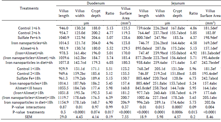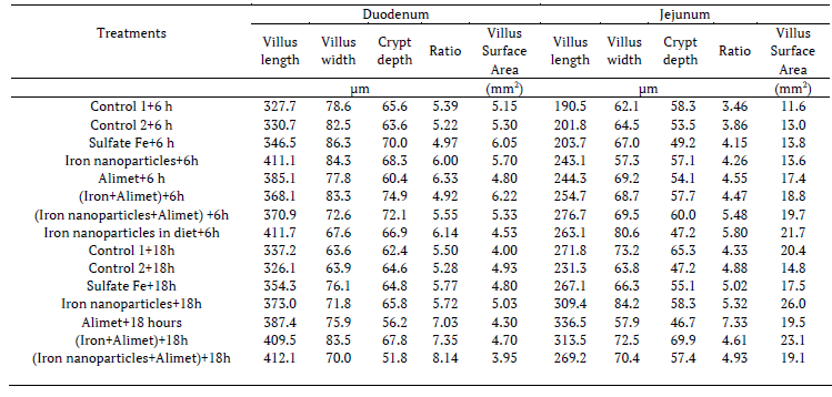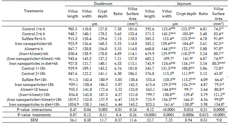 The main effects of duodenum crypt depth were increased by in ovo injection of Alimet+iron sulfate. Ratio of duodenum villus length to crypt depth was increased by control 1 and Alimet+iron sulfate nanoparticles comparison to Alimet, iron sulfate nanoparticles and Alimet+iron sulfate (p < 0.05). Significantly increased jejunum villus length was observed by Alimet+iron sulfate nanoparticles compared with all two controls, sulfate iron and iron sulfate nanoparticles (p < 0.05). Also significantly increased ratio jejunum villus lengths to crypt depth compared to all treatments were found by dietary iron nonoparticles (p < 0.05). The highest jejunum villi width and surface area were recorded in dietary iron nanoparticles with late feeding (p < 0.05). In ovo injection of Alimet with late feeding resulted in decrease jejunum crypt depth (p < 0.05) (Tables 12, 13).