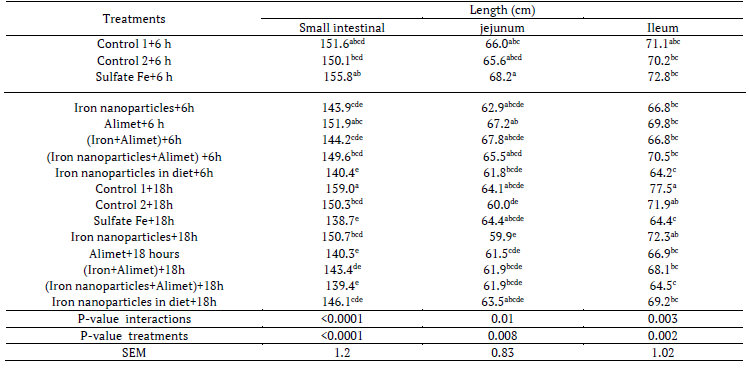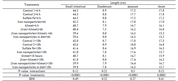Increased jejunum and intestine length were found by treatment control 1 in late feeding (p < 0.05). Significantly increased the duodenum length was achieved by iron sulfate with early feeding at 42 days of age (p < 0.05) (Tables 7, 8, 9).