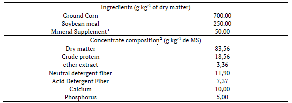 For this study, the cows were submitted to estrus synchronization and artificially inseminated at fixed time. After 30 days, the pregnancy diagnosis was performed by trans-rectal ultrasonography, selecting 15 pregnant cows, aged 4±1 years and body condition score (BCC) 7±1 and body weight of 400 ± 50 kg. During the experimental period the cows remained in pasture paddocks with an area of 8 hectares, formed by pastures of Panicum maximum cv. Mombaça and Brachiaria brizantha cv. Marandu and Xaraés. In the late afternoon, the cows were collected, and offered concentrate supplementation in a collective trough at the rate of 2 kg for each animal. The supplementation consisted of ground corn, soybean meal and mineral supplementation (Fosbovi 20®, Tortuga, São Paulo, Brasil) for beef cattle, based on dry matter (Table 1).