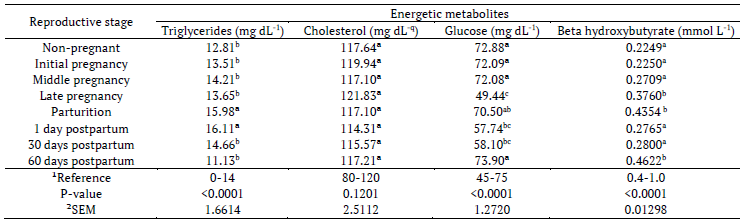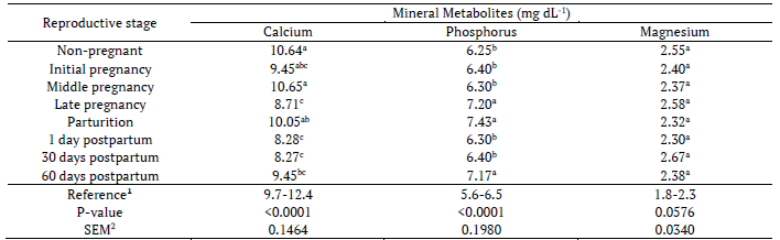 The serum mineral profile was influenced by the reproductive stages, which there were changes in the serum concentrations of calcium (p < 0.05) and phosphorus (p < 0.05), but the serum concentrations of magnesium did not change (p > 0.05) (Table 2).