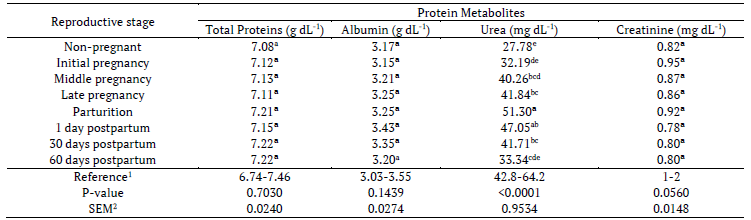 According the protein profile of cows it was verified that the total protein (p > 0.05), albumin (p > 0.05) and creatinine (p > 0.05) did not differ between reproductive stages, however, the serum urea concentrations were altered (p < 0.05) (Table 3).