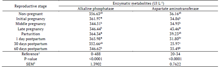 There was a significant difference (p < 0.05) in Alkaline phosphatase values over the periods studied, with differences between the initial third of gestation in relation to the gestational thirds, at the end and the second puerperal month, with the highest values of AF at parturition and one day after parturition. Alkaline phosphatase is considered of little importance in the evaluation of hepatic diseases in ruminants, due to its great range of physiological variation.
