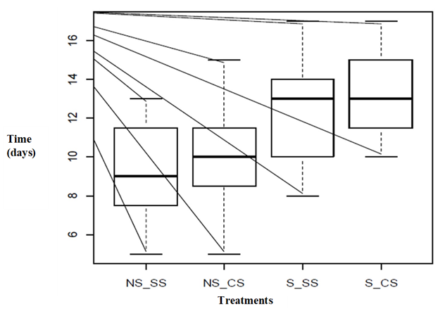 For drone spermatozoa viability, it was analyzed the viability time (in days), considering the model: