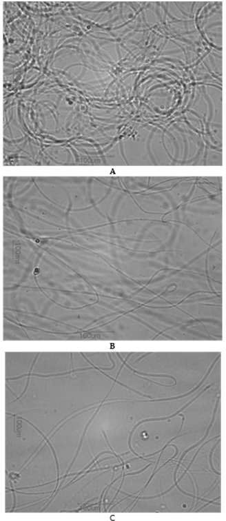 The mean spermatozoa vigor value was 4 points, and this intensity of spermatozoa movements is characterized within a score from 1 to 5. To perform this evaluation, we used different semen dilutions for a 100-fold magnification, being 0% dilution, 50% and 60% diluted in 0.9% saline (Figure 2).