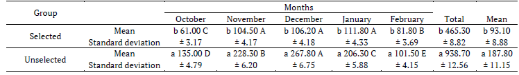 There was a difference (p < 0.05) in male brood production over the months, ranging from 61 offspring in October to 111.80 offspring in January in the group with genetic selection (Table 1). For the unselected group, there was also a difference over the months, with the lowest number of broods in February (101.50) and the largest in December (267.80). The group without selection obtained, on average, 153% more of produced drones than the selected colonies. Possibly the largest drone brood production in December and January was due to favorable weather conditions for the reproduction of Africanized honeybees, with high temperatures and low air humidity. In addition, summer succeeds spring, when there is a greater abundance of natural resources for honeybees to develop and start the reproductive cycle, having as one of the main characteristics the increase in male production (Smith, Ostwald, Loftus, & Seeley, 2014).