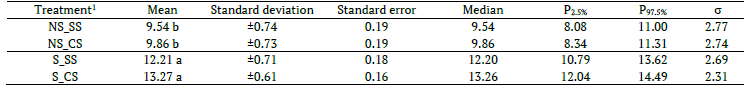 It was considered that the response (Yij) follows normal distribution, that is, Yij ~ N (μj,σj2), i = 1, 2, ..., nj for j-th treatment levels. For each μj and σj2 were considered a priori, respectively, μj ~ N (0, 10-6) and σj2 ~ Gamma (10-3, 10+3), according to the OpenBUGS parameterization.