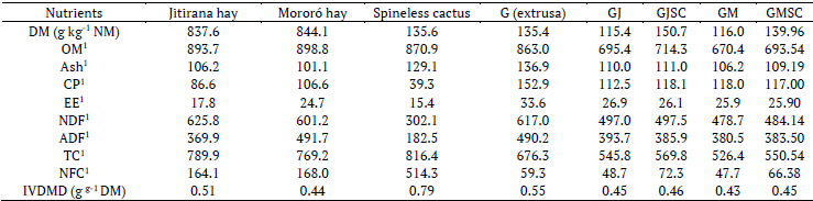 The dry matter (DM), crude protein (CP), ether extract (EE), ash and organic matter (OM) were determined according to the methodology described by the Association of Official Analytical Chemists (AOAC, 1997). The determination of neutral detergent fiber (NDF) and acid detergent fiber (ADF) was carried out according to the method proposed by Van Soest, Robertson, and Lewis (1991). Total carbohydrates (TC) were estimated by the equations described by Sniffen, O'Connor, Van Soest, Fox, and Russell (1992): TC = 100 - (% CP + % EE + % Ash). To obtain non-fibrous carbohydrates (NFC), the equation described by Hall, Hoover, Jennings, and Webster (1999) was used, where NFC = % TC -% NDF.