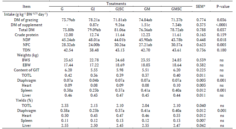 There was an effect of treatments (p < 0.05) on a total dry matter (DM) of grazing intake, supplement intake, neutral detergent fiber (NDF) and non-fibrous carbohydrates (NFC) intakes. However, the intakes of crude protein (CP) and total digestible nutrients (TDN) did not differ (p > 0.05) among treatments (Table 2).
