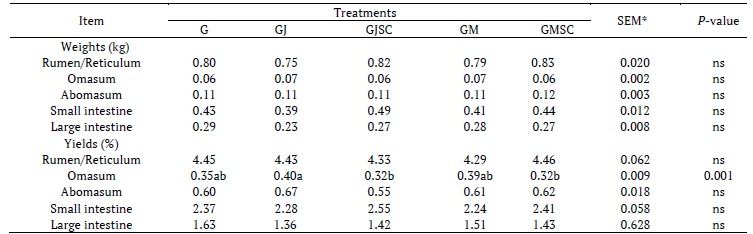 The mean weights, as well as the yields of viscera (Table 3), did not differ statistically (p > 0.05) among treatments, except for omasum yield in relation to empty body weight; this variable may have been influenced by the intake of NDF.