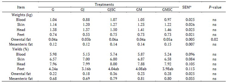 Body weight at slaughter, empty body weight, gastrointestinal tract content, absolute weights of TOTL (Tongue + Oesophagus + Trachea + Lungs), heart, liver and TOTL, heart, spleen, and liver yields were not significantly influenced by treatments (p > 0.05, Table 2).