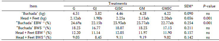 Regarding the weight of the head + feet, the highest values were observed in the animals fed with the Jitirana hay and spineless cactus supplementation. However, no significant effect of treatments on head + leg yields was observed in relation to BWS and EBW, which presented averages of 8.96% and 11.85%, respectively.