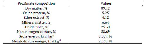 Before the field experiments, the proximate composition of the açaí meal was determined at the facilities of the Forage and Pasture Laboratory, Faculty of Agricultural Sciences, Federal University of Amazonas. Analyses were performed according to the methodology proposed by Silva & Queiroz (2002) for all the main parameters of evaluation of the proximate composition according to the Weende system (Dry matter - DM, Ether Extract - EE, Crude Protein - CP, Mineral Matter - MM, Crude Fiber - CF and Non-Nitrogen Extract - NNE), with the results listed in Table 1.