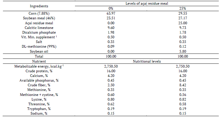 Isonutritive diets (Table 2) were formulated by the computer software SUPERCRAC (2008) to meet the nutritional requirements of the animals and according to the values of the ingredients provided by the Brazilian Tables for Poultry and Swine (Rostagno et al., 2017), except for composition of the açaí residue meal, which used the values obtained in the physical and chemical characterization of the product.