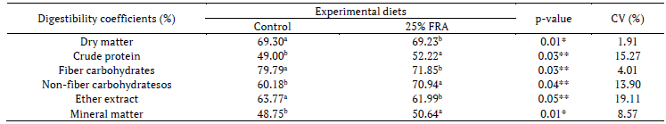 In contrast, there was a different behavior in the utilization of nutrients that are not totally dependent on enzymatic digestion, such as dry matter, which represents the nutrients in general, fiber carbohydrates and ether extract, which represents fat. In this case, there was a worse utilization of these nutrients, which can be attributed to both the high content of dietary fiber in relation to the control diet and the type of fiber that was used, especially soluble fiber.