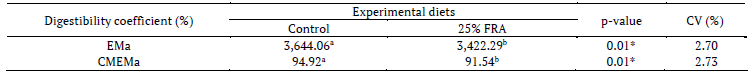 The results regarding the apparent nutrient digestibility coefficients of the diets are listed in Table 3. Differences (p < 0.05) were detected in the digestibility of all evaluated nutrients.