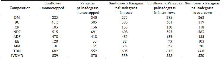 Chemical-bromatological were carried out for fresh sunflower and Paiaguas palisadegrass in monocropped and intercropped in different forage systems, prior to ensiling, according to the methodologies described above (Table 1).