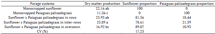 It is important to emphasize that the intercropped of sunflower with Paiaguas palisadegrass in oversown, proportion was only of 10.93%, in which there was the lowest yield of MS ha-1. This result is caused by the competition for plants, for water, light and nutrient, besides the sunflower morphology, which caused a bigger shading on Paiaguas palisadegrass, damaging the development of the plant. This indicated that this way of planting is not adequate for sunflower intercropping for the silage production.