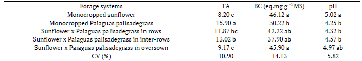 Monocropped sunflower and the intercropped in the oversown forage systems, there were lower values of titratable acidity (TA), differentiating itself from the silage of monocropped Paiaguas palisadegrass (Table 3). The titratable acidity may aid in the general aspect of the fermentative quality of silage, which influences the taste, odor, color and stability (Silva & Queiroz, 2002). Monocropped sunflower silage and the intercropped of Paiaguas palisadegrass in oversown presented high values (p < 0.05) of the buffer capacity, as a result the ensilage showed lower values of buffering capacity (Table 3).