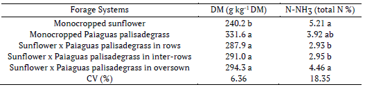 Monocropped sunflower silage and intercropped in the oversown presented higher values of N-NH3/NT (Table 4). The highest and the lowest values of DM were obtained in these forage systems. Considering the proposal of Ferrari Júnior and Lavezzo (2001) silages can be classified as desirable, if NH3-N value is less than 100 g kg-1 total nitrogen.
