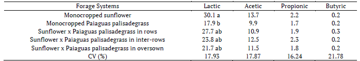 The highest content of lactic acid (p < 0.05) was the one obtained in monocropped sunflower silage (Table 5). This result shows the importance of the intercropping of sunflower and Paiaguas palisadegrass in the production of lactic acid. However, the other organic acids were not affected (p > 0.05) by forage systems.