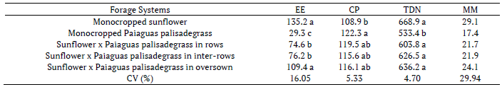 Considering the contents of TDN, the silage of monocropped sunflower presented the highest level, differing from the silage of monocropped Paiaguas palisadegrass (Table 4). This result can be related to the high contents of EE on sunflower, which helped to elevate food energy. TDN content is important, once energy and the protein are the most limiting factors for ruminants (Oliveira et al., 2010). The increase of TDN contents in silages can promote a better use of the forage by the ruminants, allowing higher consumption of energy, and, as a consequence, a better performance of the animals.