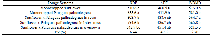 The DM content obtained for monocropped sunflower silage was the lowest compared to other forage systems (p < 0.05) (Table 4). According to Oliveira et al. (2010) the content of DM from monocropped sunflower silage is usually found, due to the fact that the structure of the plant shows a high level of humidity.