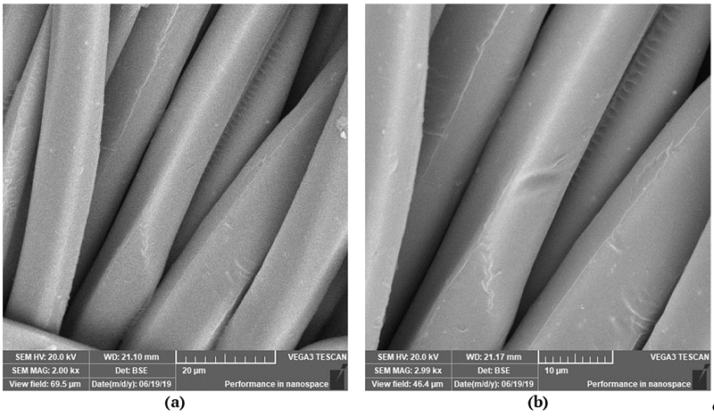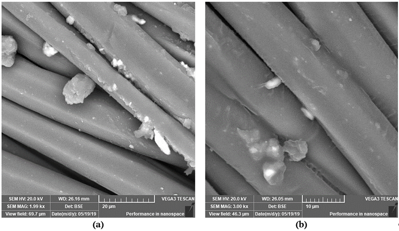 SEM was done for sample 1 before and after incubation, it was magnified in 2000 and 3000 X. Figure 1 show number of fibers with smooth surface before incubation and after washing. Figure 2 show the sample after incubation and the feedstuff particles on the surface of the fabric due to exposing the sample in the incubation conditions (oven- humidity- temperature-strength).