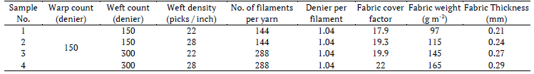 An innovative idea was done, andits main purposewasproviding a scientific study for the production of these textile bags at the local level. In this study, polyester microfiber with 1.04 denier, warp count (150) denier, weft yarn counts (150 and 300 Deniers), warp density (30 picks / inch), weft density (22 and 28 picks / inch), plain 1/1 textile structure were used to manufacture four samples of fabric. The weft yarn count of samples1 and 2, and 3 and 4were 150 and 300 deniers, respectively. While, the weft density of the samples 1 and 3, and 2 and 4were 22 and 28 (picks/inch), respectively, as shown in Table 1.