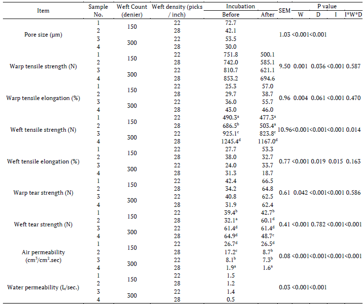 Table 1 represents the constructional parameters of the manufactured samples. Increase yarn weft count produce higher thickness fabrics. Sample 4 had the highest fabric thickness (0.29, mm). The physical and mechanical properties of the manufactured samples before and after incubation in the rumen are presented in table 2. Data show that, manufactured in situ bags had a wide range for fabrics pore size (30.0 - 72.7, µm). Fabric's pore size was significantly affected by both yarn weft count and density (p < 0.001) with no significant interaction (p = 0.089). Fabric’s pore size was decreased as increasing either weft yarn count or density. Sample 4 had the lowest fabric pore size. In contrast, sample 1 had largest pore size (72.7 µm) with lowest weft count and density.
