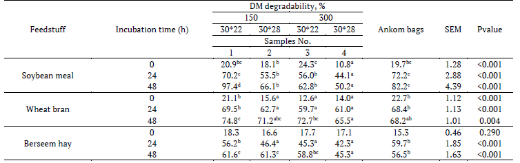 Since, in situdegradability depends mainly on the efflux of digested feed particles from the pores of the bags, the results were highly affected by bags,pore size, cloth type, weave pattern and bag dimensions (Adesogan, 2005; Valente et al.,2011; Valente et al., 2015). The most effect is the overestimation of feed degradability which was observed due to loss of undigested fine particles from bags pores (Mabjeesh et al., 2000; Wilman & Adesogan, 2000).