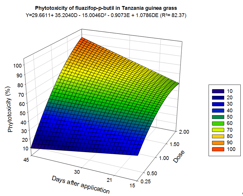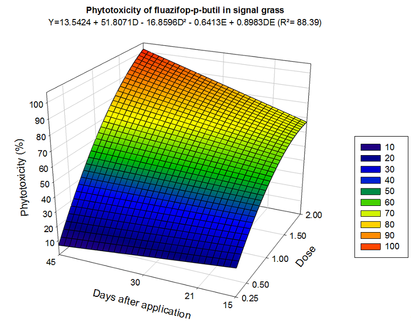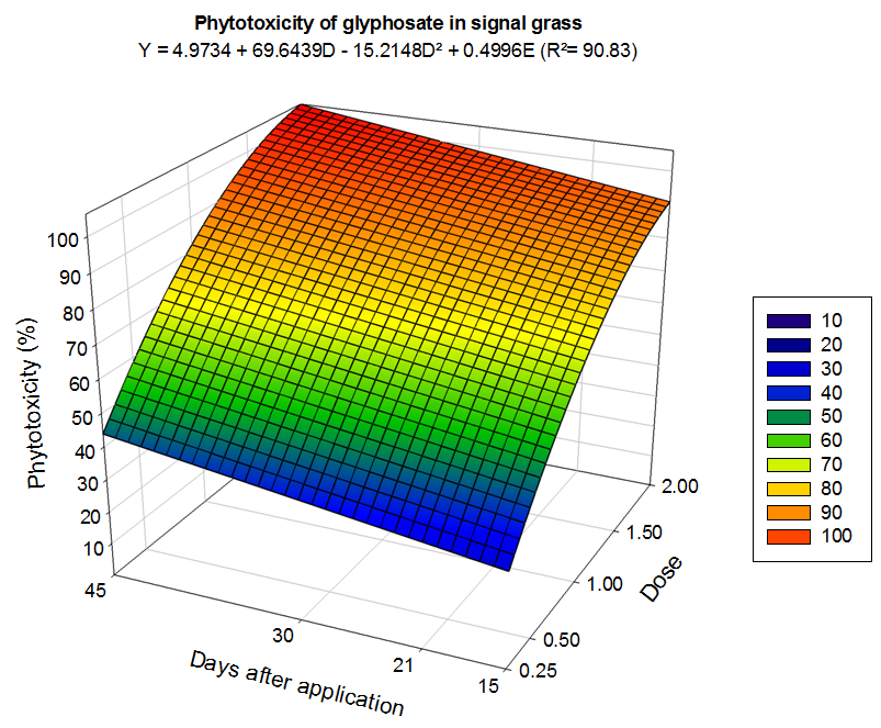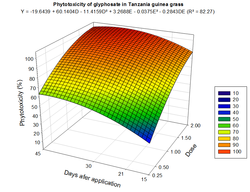 Mean values were tested by analysis of variance at 5% probability using the SAS software. Subsequently, data referring to control of signalgrass and guinea grass intoxication were subjected to response surface analysis, with the aid of the software Sigma Plot®, version 12.5. The best fit equation was selected according to the coefficient of determination, the level of significance of the regression coefficients and the biological response.