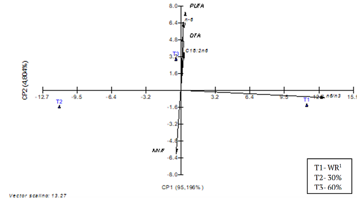 According to the multivariate analysis, the first main component best explains the original data, given the high percentage found. Therefore, these variables are representative, based on linear combinations, corroborating Vainionpää et al. (2000). Thus, the PUFA, DFA, n-6 and C18:2n-6 ratios were higher, with greater variability, indicating their close relation to meats from animals subjected to 60% feed restriction.
