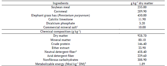 Dietary restriction should not interfere with the animal's energy metabolism and consequently protein metabolism, keeping parameters within the established range as normal for the species. Due this, the latter restriction level was based on the minimum maintenance requirements recommended by the National Research Council (NRC, 2007). According to this recommendation, the lambs were fed complete feed, which consisted of 45% elephant grass hay (Pennisetum purpureum) and 55% concentrate-soybean meal, cornmeal, calcitic limestone, dicalcium phosphate, and mineral salt (Table 1)-in order to meet the nutrient requirements for lambs from 30 to 45 kg, being that the experimental diet was formulated based on the gain requirements of 250 g day-1 mean daily gain.