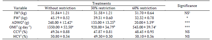 The findings showed that animals subjected to the highest restriction level, with significantly lower (p < 0.05) OMI, had a greater decrease in the parameters tested and showed lower LWS, resulting from the low ADWG, as shown in Table 2.