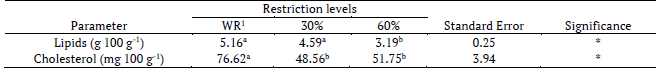 Studies on published nutritional aspects indicate that lamb meat has low total lipid levels, which may range from 2% to 8% (Jabbar & Anjum, 2008; Madruga et al., 2006), in line with the levels found in the present study. The group subjected to 60% restriction showed a decrease in lipid levels, which may be associated with lipid synthesis by the animal. In a study characterizing Santa Inês lamb meat, Madruga, Sousa, Rosales, Cunha, and Ramos (2005), concluded that diet had a significant effect on cholesterol levels, indicating that feed may improve meat quality.
