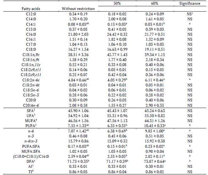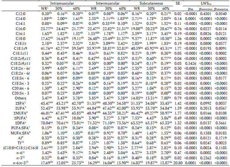In this context, the PUFA:SFA ratio is commonly used to analyze the nutritional value of oils and fats and indicates the cholesterolemic potential (Arruda et al., 2012). A significant interaction existed between the types of fat and the restriction levels; the highest PUFA:SFA ratios (p < 0.05) were found in the subcutaneous fat WR and the intramuscular fat with 60% restriction, and the PUFA:SFA ratios were similar (p > 0.05) between WR and 30% restriction.
