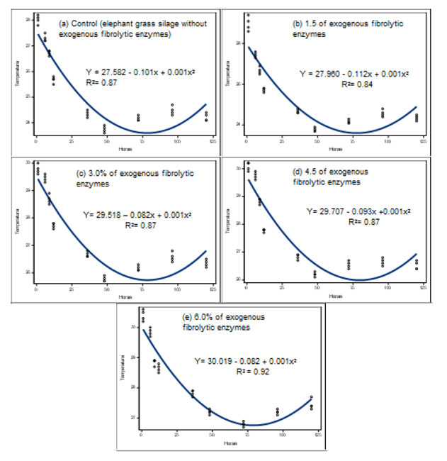 On the other hand, in the 48-hour reading, for most treatments, the temperatures were close to those established as ambient temperature. The only exception was for the level 6.0% fibrolytic enzymes, whose temperature recorded at that time was 26.7°C, a value close to an aerobic deterioration condition.