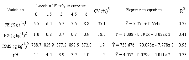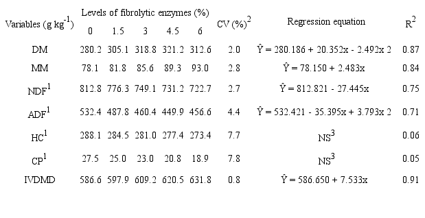 From the results in Table 3, it is observed the effect of the levels of fibrolytic enzymes on DM (p < 0.0001), MM (p < 0.0001), NDF (p < 0.0001), ADF (p < 0.0001) and IVDMD (p < 0.0001).